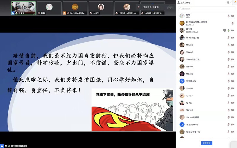 学院党委副书记、副院长孙汉中主持会议,强调了当前疫情防控形势的复杂性、学校疫情防控工作的艰巨性。他希望每一位同学要时刻绷紧疫情防控这根弦,坚定信心、坚守底线,毫不放松、慎终如始做好疫情防控工作。他要求全体本科生:一要提高思想站位,强化责任担当,从讲政治、讲大局的角度充分认识疫情防控工作的严肃性;二要牢固树立规矩意识,严格执行学校防疫的相关规定,积极配合常态化核酸检测、健康日报、公安大数据流调等疫情防控常规工作;三要学会调整心态,克服疫情引发的负面情绪,保质保量完成学习任务。