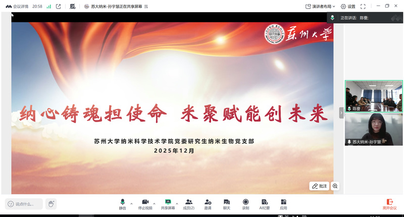 孙宇慧重点介绍了其所在研究生纳米生物党支部三个重点建设内容:一是聚焦铸魂赋能,夯实人才自“立”根基,通过立心、立志、力行筑牢思想与行动根基;二是聚力学术奋博,推动科研自“信”发展,在实干、合作与应用中增强创新底气;三是聚智科技报国,践行自“强”时代使命,推动党建与产业链结合,引导党员将青春奋斗融入国家发展。